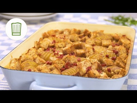 Dieser Auflauf sieht mit seinen Kartoffel-Fächern einfach herrlich aus. Gebettet in eine Creme aus Sauerrahm, Crème fraîche und Brühe bleibt er wunderbar saftig, bekommt durch Brot und Speck aber auch eine knusprige Note. Im Video seht ihr, wie er gelingt.